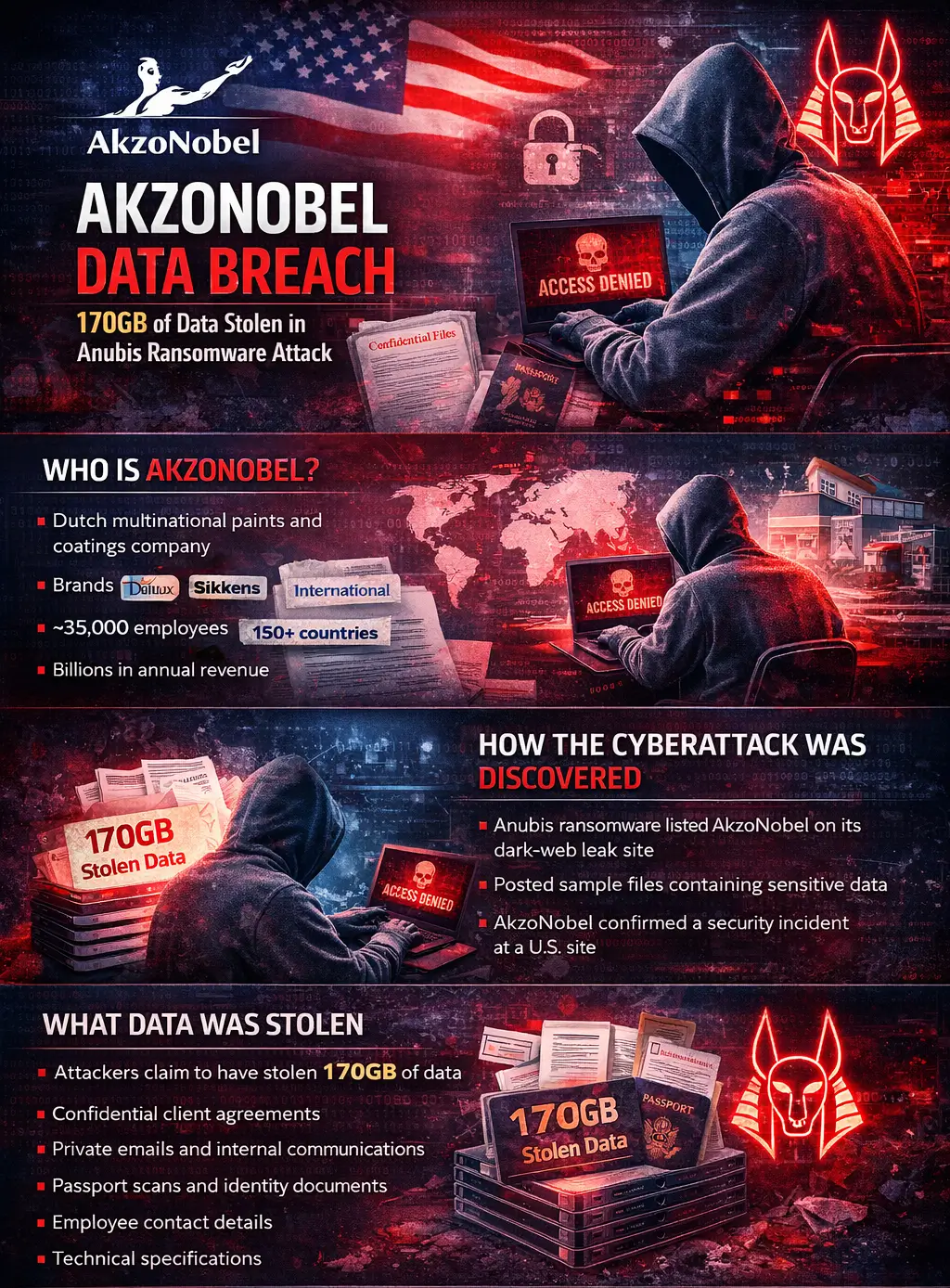 In early March 2026, AkzoNobel confirmed that hackers breached the network of one of its United States facilities. The attack was allegedly carried out by the Anubis ransomware group, which claims to have stolen 170GB of sensitive corporate data.