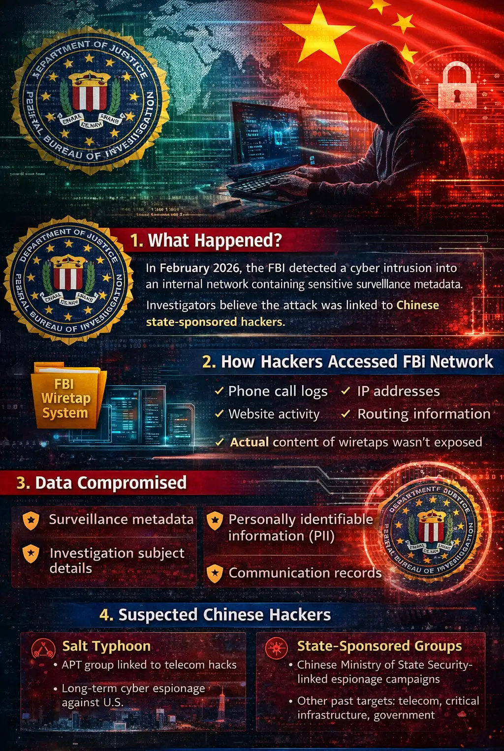 In early 2026, the United States government began investigating what is now widely described as the FBI surveillance network breach, a cyber incident suspected to involve Chinese state-sponsored hackers infiltrating an internal surveillance system used by federal investigators.