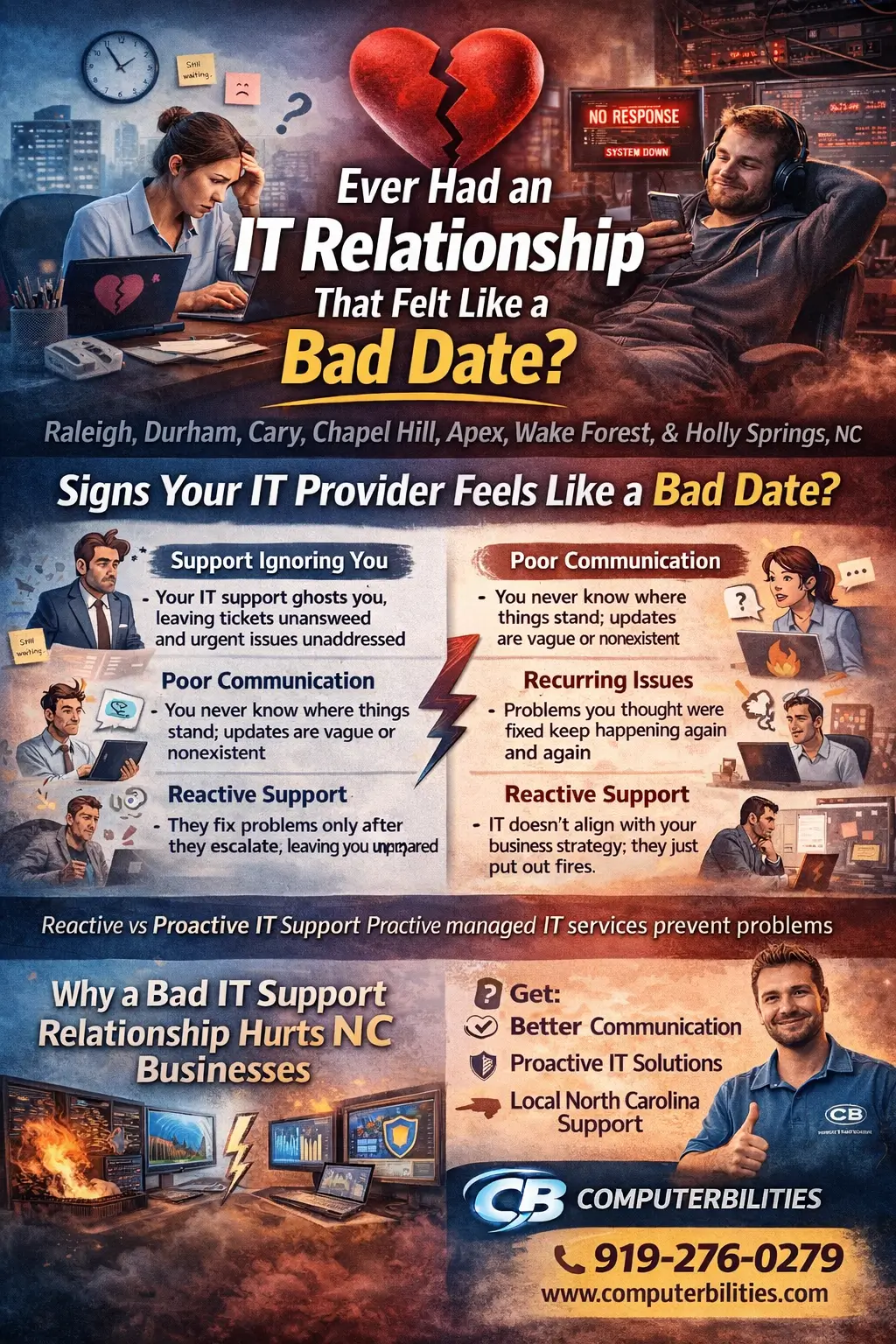 At Computerbilities, we’ve spent decades helping North Carolina businesses recover from bad IT relationships and replace them with proactive, dependable IT partnerships. And one thing is clear: when your IT support feels like a bad date, it’s not just awkward—it’s risky.