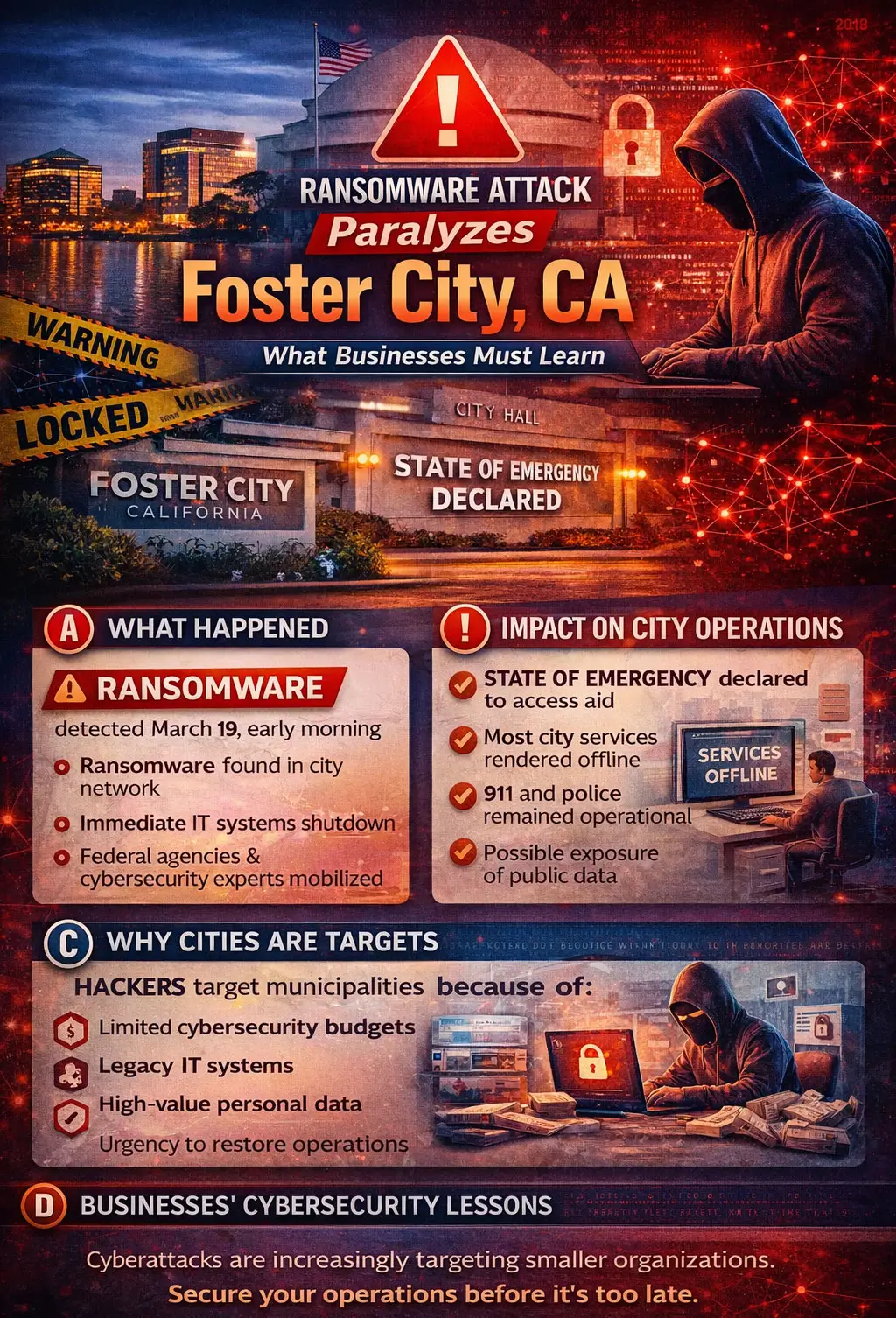 In March 2026, a ransomware attack in Foster City, California sent shockwaves far beyond the Bay Area. What began as a cybersecurity incident quickly escalated into a full-blown operational crisis—forcing city officials to shut down systems, disrupt public services, and ultimately declare a state of emergency.