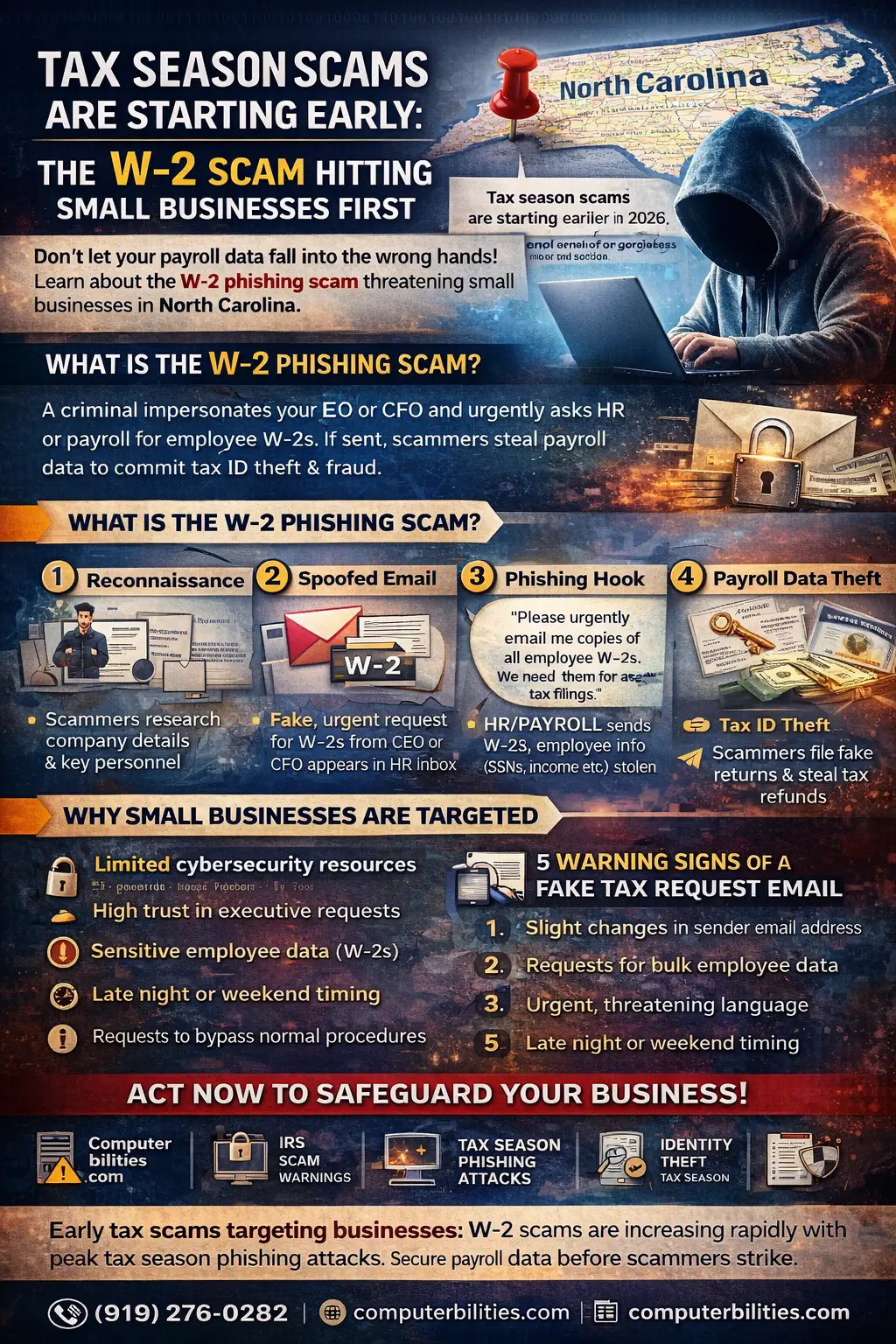 Tax season fraud is no longer a possibility — it is an active and growing threat. From Raleigh to Durham, Cary to Chapel Hill, small businesses across North Carolina are being targeted by sophisticated W-2 phishing scams and tax season fraud schemes.