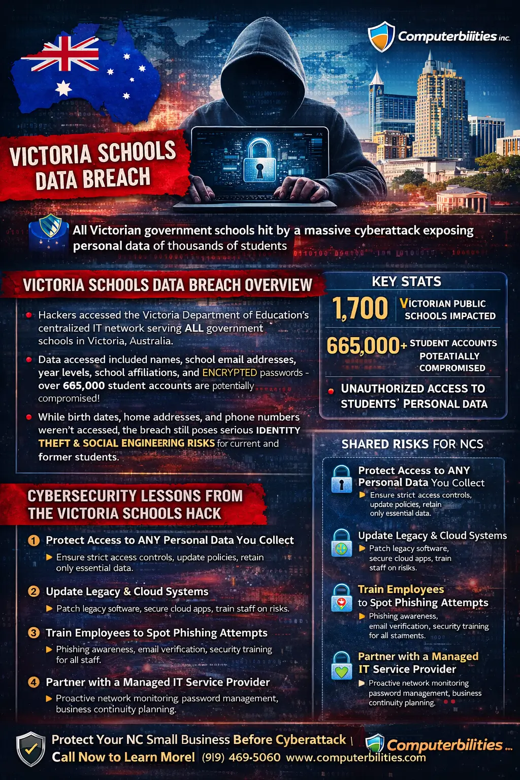 In January 2026, news of a Victoria schools data breach sent shockwaves through the global cybersecurity community. Hackers infiltrated the Victorian government school network, exposing personal information belonging to thousands of students—both current and former. While the incident occurred in Australia, its implications extend far beyond national borders. For small and mid-sized businesses (SMBs) in North Carolina, particularly in Raleigh, Cary, Durham, Chapel Hill, Apex, and Wake Forest, this breach serves as a powerful reminder: no organization is too large—or too public—to be targeted, and no organization is too small to be affected.
